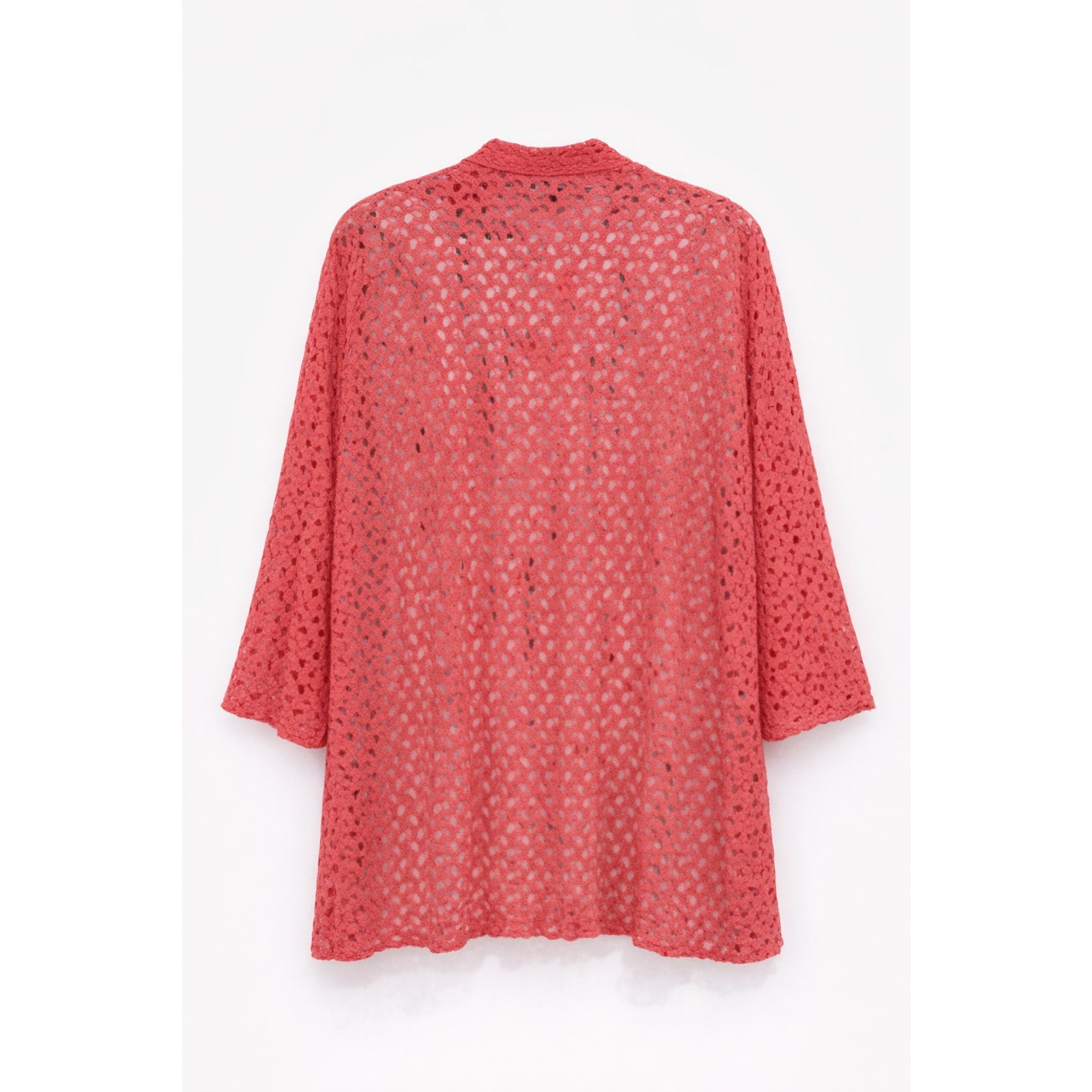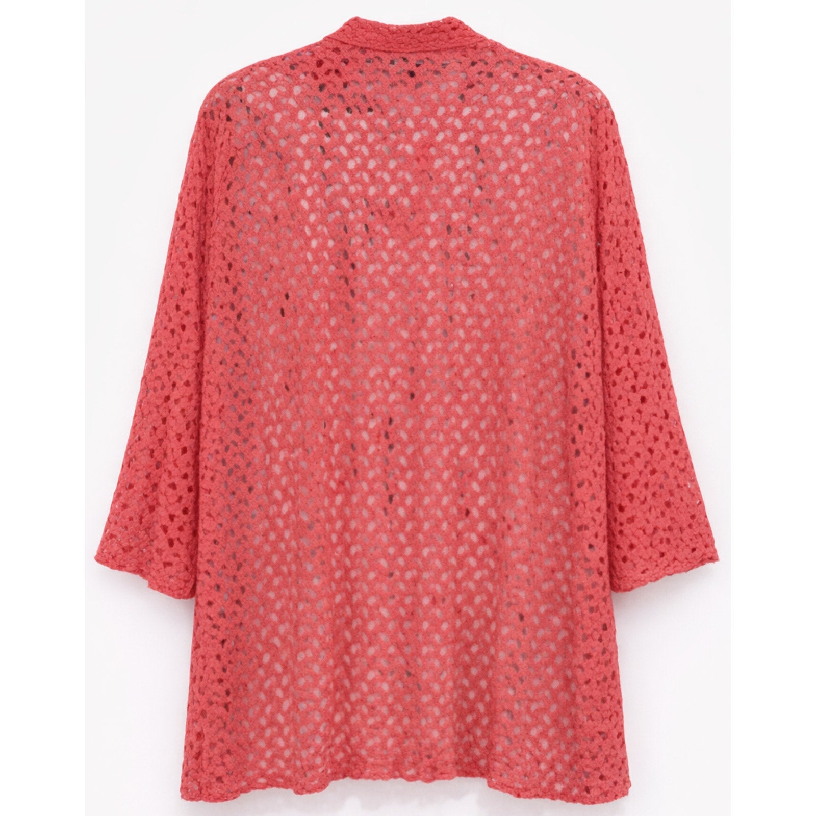 Lightweight coral crochet lace cardigan with floral openwork, 3/4 sleeves, and soft,easy drape. Perfect for layering, boho outfits, and warm-weather styling The open-knit design adds texture without weight, making it perfect for layering over tanks, dresses, or camis. Three-quarter sleeves and a relaxed fit create an effortless,